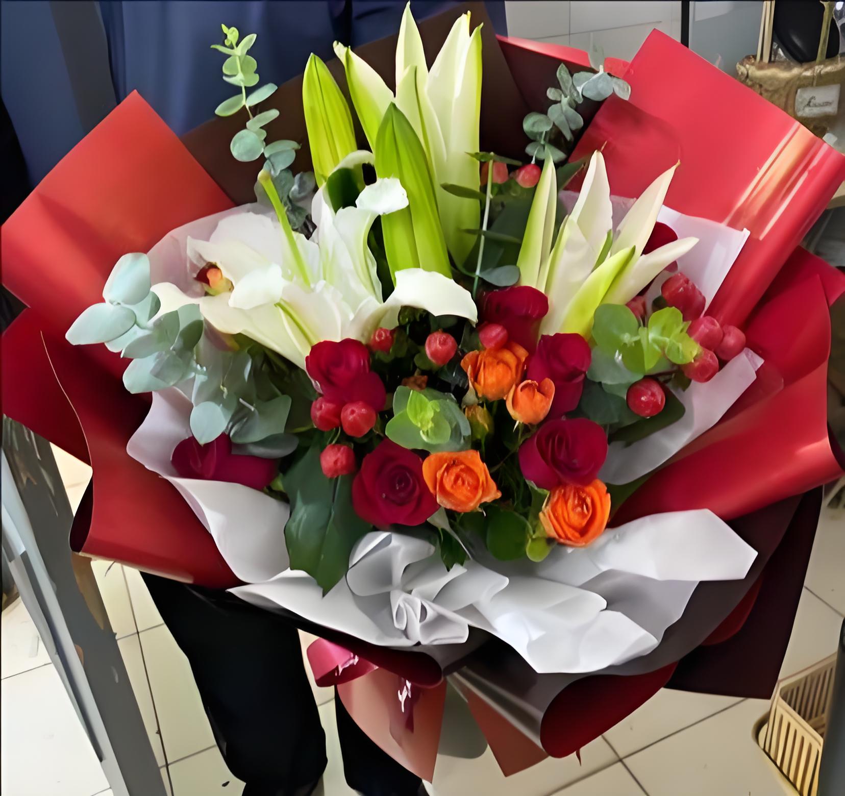 保山隆阳区花店包11枝红玫瑰、2枝多头白百合、6枝橙色多头玫瑰、红豆、尤加利叶